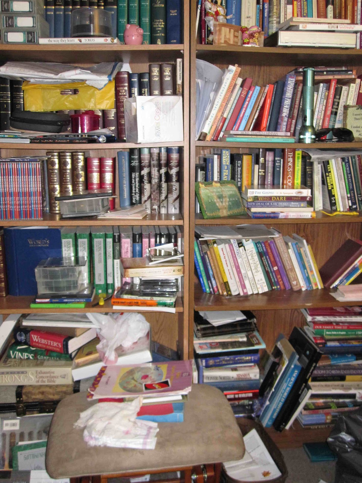 The bookshelf pictures were from about 2 weeks ago… I did a major decluttering and re-shelving of books. When little fingers think the bookshelves are playgrounds, nothing is safe! Most of the messiness is moved and ‘rearranged’ books. The “after” picture is almost what it looked like again this morning after we removed several layers of toys… SO happy! I took pictures to PROVE that they CAN look nice 🙂 with all the books on the shelves and “in their home.”